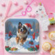 Eine herzliche Ferienillustrierung mit einem fröhlichen Hund, der im Schnee spielt, eine Weihnachtsmannmütze trägt und von bunten Geschenkboxen umgeben ist. Im Hintergrund bauen die Kinder neben einem schneebedeckten Weihnachtsbaum einen Schneemann und schaffen so ein fröhliches Winterwunderland. Ideal, um Feiertagssjubeln zu verbreiten und den Zauber von Weihnachten zu erfassen.