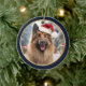 An der Vorderseite dieses Holiday-Ornaments befindet sich ein schönes Porträt eines belgischen Tervuren Hundes, der eine rot-weiße Weihnachtsmannmütze vor schneebedeckten Winterkiefern trägt. Das Bild ist in glänzendem Gold und dunkelblau gerahmt. Auf der Rückseite des Ornaments befindet sich Ihr eigener Text in Gold.