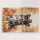Ein Aquarellbild eines fröhlichen Hundes inmitten eines Haufen lebendiger Herbstlaub, umgeben von winzigen Kürbissen und verstreuten Eichhörnchen. Der Hund trägt einen kleinen Pilgerhut und strahlt vor Freude aus, um den Geist des Erntedanks zu erfassen. Im Hintergrund sorgen weiche Erntefelder und goldfarbene Bäume für eine friedliche Landschaft. Die sanfte Struktur und die warmen, gedämpften Herbsttöne verleihen der Szene ein gemütliches, nostalgisches Gefühl, das perfekt ist, um die Schönheit der Saison zu feiern.