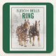 Untersetzer mit dem Sprichwort: Schlittenglocken läuten. Entworfen mit einem Outdoorsfoto mit einem Team von 2 belgianischen Zugpferden, die einen Schlitten ziehen. Schneeflocken fallen sanft mit schneebedeckten Kiefern im Hintergrund herunter.