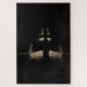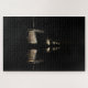 Schwieriges Puzzle mit den berühmten Windmühlen von Kinderdijk in Folge entlang dem Kanal mit Reflexion im Wasser, belichtet in der dunklen Nacht, eine surreale Szene in den Niederlanden schaffend. Hartes Puzzle, zum wegen der vielen Schwarzstücke abzuschließen.