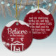 Believe in the wonder, Religious Holiday Ceramic Ornament with berry red sparkle glistening glow Nativity Scene capturing the Christmas magic and joy of a Christian season. On the back, the sacred writing, Luke 2:12 states, "And this shall be a sign unto you; Ye shall find the babe wrapped in swaddling clothes, lying in a manger" all in customizable text, ready for you create your favorite bible verse in festive devotional design hanging decorations. Order your Christ teachings testaments today and make your custom inspirational doctrine keepsakes extra special with divine passages of the word of our Lord! 🎄⛪️