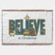 Beautiful nativity scene on a throw blanket with the word "Believe" containing the manger, Jesus, Mary, Joseph, a shepherd, sheep and a donkey. On the back is the scripture from John 3.16. Would make a thoughtful Christmas gift for Christian family and friends.