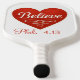Fun festive pickle ball paddle sure to make you smile with a red heart and the word Believe in white, quote Phil. 4.13. Red heart with gold on backside with quote Rom. 8.37. Thoughtful gift idea this holiday season for Christian friends and family members that enjoy pickleball. Personalize it with your own quotes. Good all year round.