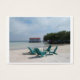 Ruhe am Strand von Belize, Adirondack-Stühle, rosa Häuser, weißer Sand, blaues Wasser, Bäume