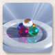 Ein 3D-Bild in Vue, voll von Reflexionen und Lichtern, die aus allen Richtungen leuchten. Fünf farbige Kugeln aus blau, rosa, türkis, orange und diamond gläsernen in einer Pyramide, die von einem durchscheinenden weißen Ring umgeben ist. Sie sitzen auf einem überwältigenden Hintergrund von blassblauen und weißen Strahlen, die sich unter den fünf Kristallkugeln aneinander reihen.