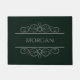 BEZEICHNBAR GREEN ELEGANT CUSTOM DOORMAT. Stilvolles Waldgrün und Silber scrollen individuelle Vordertür Matte personalisiert mit Ihrem Namen. Erhältlich in zwei Größen. Die Hintergrundfarbe kann geändert werden. Dargestellt ist der vollständig anpassbare Name, Morgan. Von Heard_.