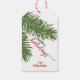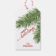 Moderne Weihnachtsgeschenk-Tag mit Happy Holidays Text Zitat in schlichter, minimalistischer, weißer Typografie-Schriftart auf Kiefernnadeln auf einem knusprigen weißen Hintergrund. Mit der Option, um mit Familie oder Firmennamen oder kurzen Text Ihrer Wahl.