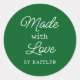 Anpassbare Aufkleber "Made with Liebe" in Waldgrün. Fügen Sie einfach Ihren Namen hinzu.