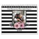 Benutzerdefinierte Foto-Blumenstreifen Erstellen Sie Ihren eigenen Kalender 2022. Der Kalender ist perfekt für Familien mit Kindern, frisch verheiratete Paare und beste Freunde! Legen Sie Ihre eigenen Fotos für einen schönen Speicher-Sake ein, während Sie Ihr Jahr planen. Modernes, romantisches und elegantes Cover-Design mit Schwarz-weißen Streifen und blütenrosa boho Aquarellblumen.