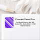 Das Design des Rückadresslabels weist ein gestreiftes Muster mit lila oder weißen Linien auf. Es verfügt auch über einen personalisierbaren Personen-, Familien- oder Firmennamen, der über eine individuell anpassbare Postanschrift hinausgeht.