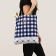 Diese elegante und personalisierte Tasche ist mit einem klassischen marineblau-weiß karierten Muster mit einem benutzerdefinierten Monogramm "M" und dem Namen "Morgan" in einem stilvollen, kursiven Schriftart ausgestattet. Der untere Teil der Tasche zeigt ein hellgraues Rautenmuster mit kleinen marineblauen Herzen. Ideal für den täglichen Gebrauch, Einkäufe oder als nachdenkliches Geschenk. Dauerhafte schwarze Griffe sorgen für Komfort und Stil.