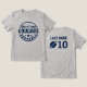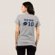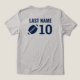 Custom Front and Back Football T - Shirt - in athletischem Grau mit marineblau-blauem Design mit einem stilvollen runden Logo mit Fußball-Helm, US Flagge. Personalisieren Sie Ihre Spiele mit dem Namen Ihres Spielers, der Jersey-Nummer und dem Nachnamen Ihres Spielers. Enthält einen Fußball-Akzent auf der Rückseite.
