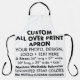 Maßgeschneiderte personalisiert Large All Over Print Schürze, 34" lang x 27" breit, ist 100% weiches und langlebiges, maschinenwaschbares Polyester mit unbegrenzten Schürze-Gurt-Farboptionen. Große Mengenrabatte für mehrfache Einkäufe von Bulkware. Entwerfen, erstellen, erstellen Sie eigene hochwertige Schürze aus einer leeren Vorlage. Passen Sie Ihre Schürze mit einem Foto, Logo, Monogramm, Bild oder Design an und fügen Sie Ihren eigenen Text hinzu. Diese hochqualitative, von den neuesten Entwicklungen geprägte Schürze bietet drei Möglichkeiten: Groß - 34" lang x 27" breit, mittel - 30" lang x 26" breit oder klein - 20" lang x 24" breit für Kinder. Eine maßgeschneiderte Schürze macht ein großartiges, anpassbares, personalisiertes Geschenk für einen Koch, einen Koch, für Mama oder Papa, eine neue Zuhause, Weihnachten oder für jedes Bäckerei- oder Lebensmittelgeschäft. Personalisieren Sie die Kleidung Ihres Restaurants, Bar, Bistros oder Cafés mit qualitativ hochwertigen Logo-Schürze.