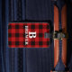 Dieses Design zeichnet sich durch ein rotes und schwarzes Tartan-Muster sowie ein Monogramm in der Mitte des Gepäckanhängers aus. Sie können dieses Element mit dem Vor- und Nachnamen Ihrer Familie personalisieren, indem Sie die benutzerdefinierte Vorlage verwenden.