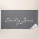 Dieses individuell gestaltete Strandhandtuch trägt Ihren Namen in schönen handgeschriebenen Schriftzeichen auf einem stilvollen kohlegrauen Hintergrund. Gute Geschenkidee.