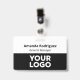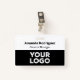 Machen Sie Ihr Unternehmen beruflich mit individuelle Name-Abzeichen mit Ihrem Firmenlogo, Mitarbeitername und Jobtitel. Passen Sie es in der Seitenleiste an. Der Name des Mitarbeiters erscheint oben in fett gedruckter schwarzer Schrift mit dem Titel des Jobs oder dem benutzerdefinierten Text darunter in einem schwarzen kursiven Schriftart auf weißem Hintergrund. In der unteren Hälfte des Abzeichens befindet sich Ihr Logo auf einem schwarzen Hintergrund. Dieses Design funktioniert am besten mit weißen oder hellen Logos.