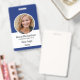 Benutzerdefiniertes Mitarbeiter, Foto, Bar, Logo, Name Abzeichen Sie können diese Vorlage anpassen, indem Sie Ihr Foto, Name, Beruf, Ihr Firmenlogo und Bar. Einfaches, berufliches Blau-Weiß-Design mit Foto-Rahmen