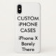 Maßgeschneiderte personalisierte Schrift BARELY DA SLIM iPHONE X FALL Blank Template. Entwerfen, erschaffen, eigene machen. Ihr Foto, Bild, Text, Logo, Grafiken in einem farbigen Vollfarbdruck mit glänzender Oberfläche. Entwickelt für das Apple iPhone X. Das extrem schlanke, schlanke und stilvolle Dünnprofil ermöglicht eine leichte, aber schlagfeste, haltbare Hartplastik-Muschel, die das drahtlose Laden nicht beeinträchtigt und den Zugang zu allen Ports, Kontrollen und Sensoren ermöglicht. Flachlagevorsatz, der den Bildschirm vor direkter Auflage schützt