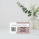 Ein Imitat Rose Gold Glitzer Sets aus dem Hintergrund dieses Visitenkartendesigns mit QR-Code auf der Vorderseite. Füllen Sie die Vorlagenfelder aus, oder klicken Sie auf Anpassen, um den gewünschten Stil, die gewünschte Größe und Schriftart auszuwählen. Stellen Sie sicher, dass Sie Ihren QR-Code auf der Vorderseite hinzufügen. Verwenden Sie den QR-Code-Link, um Kunden zu Rezensionen, Fotos, Ihrer Website oder einem anderen wichtigen Link zu schicken. Der leere Rücken verlasse viel Platz für persönliche handgeschriebene Notizen. Sie können dieses Design auch dem Visitenkarten-Magneten oder einem der anderen Produkte hinzufügen, wo es passend ist, wie es im TRANSFER-Scroll-Bar auf dieser Seite dargestellt ist.