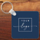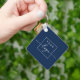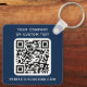 Doppelseitiger Schlüsselanhänger mit eigenem Logo, QR-Code und benutzerdefiniertem Text auf dunkelblauem oder benutzerdefiniertem Farbhintergrund. Ändern Sie die Schriftart- und Schriftart-Farben, verschieben und verändern Sie Elemente mit dem Entwurfstool.