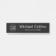 Personalisiertes Namensschild mit Logo, Name und Titel auf schwarzem Hintergrund