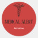 Rote medizinische Warnaufkleber zur Pflege - Top hat ein schwarzes Symbol für medizinische Kadukus. Unten steht "MEDICAL ALERT" in schwarzer Schrift. Benutzerdefinierter Text zum Drucken von Gesundheitszustand, Allergien oder anderen medizinischen oder gesundheitlichen Details darunter. Vollroter Hintergrund, der in eine beliebige Farbe geändert werden kann. Klicken Sie auf Anpassen, um Textfarben, Textgröße und Schriftart-Stile zu ändern.