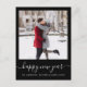 Eine einfache, aber elegante Karte, die Ihnen hilft, sich mit Freunden über die Meilen hinweg zu verbinden. Die Worte "Happy New Year" erscheinen in der weißen Handschrift auf einem schwarzen Hintergrund, wobei dekorative Swashes bis zu den Rändern der Karte reichen. Einfach mit Ihrem bevorzugten quadratischen Foto, Ihren Namen und dem Jahr unten in weißen Sans Serif Schriftart anpassen. Fügen Sie Ihre Rücksendeadresse auf die Rückseite.