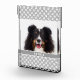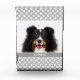 Personalisierbare und einfache Vorlage für das Foto eines Tieres auf einer grauen Hintergrundfarbe, die ein Muster von Pfoten mit weißem Hund aufweist. Es gibt auch einen personalisierbaren Textbereich für einen Namen unter dem Foto.