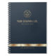 Dieses raffinierte Notebook-Cover-Design zeichnet sich durch einen beruflichen, tiefen, blauen Hintergrund und elegante Golddetails aus. Ihr individuelles Logo und Ihr Firmenname werden an prominenter Stelle in einem goldenen Ton oben dargestellt, während ein auffallendes horizontales Goldband am unteren Rand Ihre Website-Adresse subtil hervorhebt. Dieses Design verkörpert eine luxuriöse und markenbasierte Ästhetik, perfekt für eine raffinierte Aussage.