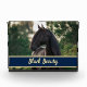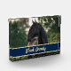 Bringen Sie Ihr Pferd mit diesem individuell anpassbaren Foto Set in Ihr Zuhause! Tauschen Sie das Bild mit einem von Ihren eigenen Reitabenteuern aus. In der Nähe des unteren ist Text in einem Marine und Gold Farbschema angezeigt. Ändern Sie den Text Ihres Pferdes. Es gibt genügend Platz, um einen vollständig registrierten oder Show-Namen zu beherbergen.
