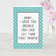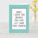 Niedliche Begrüßungskarte mit einem lustigen Zitat für die Liebe Ihres Lebens, Ehemanns oder Ehefrau, Junge oder Freundin, oder sogar Ihrer Mutter oder Ihres Vaters, auf einem hellblau-grün-weiß farbenen Polka Punkte Hintergrund. Mit der Option, um mit Namen, Wort oder (begrenztem) Text Ihrer Wahl anzupassen. Lass denen mit einem Sinn für Spaß wissen, dass du sie zum Mond und zurück mit diesem sarkastischen und humorvollen "I LIEBE YOU, WEIL SIE SIND ZUM KOTZEN WENIGER ALS DIE MEISTEN ANDEREN LEUTE" Zitat.
