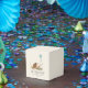 Darstellung eines Igels mit einem blauen Ballon auf einer mit Eukalyptusgrün dekorierten Saite. Igel sitzt auf Blättern im Gras neben Pilzen mit Bienen. Thema "Bereit zum Pop".
