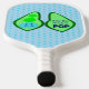 Dieses phantastische Pickleball-Paddel zeigt ein grafisches Bild eines grünen Pea-Pods mit 2 grünen Erbsen und einer großen blauen Erbse. Die große blaue Erbse hat ein niedliches kleines Gesicht mit Augen und einem Mund. Auf der anderen Seite des Pfods in dunkelrosa steht "Baby Boy Ready to Pop". Das Design ist ideal für eine Schwangerschaftsankündigung oder eine Babydusche. Im Hintergrund gibt es eine Gruppe von kleinen blauen Erbsen.
