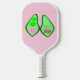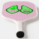 Dieses phantastische Pickleball-Paddel zeigt ein grafisches Bild eines grünen Pea-Pods mit 2 grünen Erbsen und einer großen rosa Erbse. Die große rosa Erbse hat ein niedliches kleines Gesicht mit Augen und einem Mund. Auf der anderen Seite des Pfods in dunkelrosa steht "Baby Girl Ready to Pop". Das Design ist ideal für eine Schwangerschaftsankündigung, Geschlechtsoffenbarung oder Babydusche. Im Hintergrund gibt es eine Gruppe von kleinen rosa Erbsen.