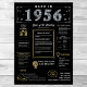 Betreten Sie das Jahr 1956 mit unserem bezaubernden digitalen Geburtstagsposter, das mit historischen Fakten, bemerkenswerten Ereignissen und faszinierenden Geschichten aus der Vergangenheit übersät ist. Dieses Geburtstagsposter mit eleganten Gold- und Silberdetails und einem fett schwarzen Hintergrund mit einzigartigen Symbolen und stilvollem Text verströmt zeitlosen Charme. Egal, ob es sich um Gespräche an Geburtstagsfeiern handelt oder um Gespräche, die als Sake geschätzt werden, es ruft nostalgische Erinnerungen hervor. Unser Geburtstagsposter bietet einen Einblick in das Jahr 1956 und erforscht Aspekte wie Durchschnittseinkommen, populäre Erfindungen, bedeutende Ereignisse, Mode-Trends und Slang der Zeit. Es werden wichtige Momente wie die erste Farb-TV-Sendung, der Babyboom der Nachkriegszeit, der Aufstieg von Rock and Roll und die Entwicklung des Polio-Impfstoffs hervorgehoben. Auch bedeutende Erfindungen wie der Fotokopierer, die Alkalibatterie und die Wasserstoffbombe werden vorgestellt und zeigen den technologischen Fortschritt der Ära. Insgesamt erfasst das Geburtstagsposter das Wesen des Lebens in den 1950er Jahren und umfasst Technologie, Lebenshaltungskosten und kulturelle Trends wie Musik und Mode. Es dient als ein unvergessliches Gesprächsstück bei Geburtstagsfeiern und Jahrestagen und macht, wenn gerahmt, einen durchdachten Sake.