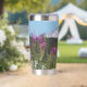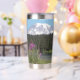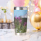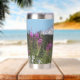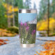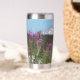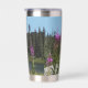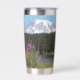 Ein trendiger Edelstahl-Thermalwäscher für Ihr warmes oder kaltes Getränk, das ein landschaftliches, landschaftliches Foto von schneebedeckten Mount Rainier und rosa Fireweed Wildblumen.