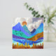 Dieses prächtige Design zeigt eine farbenfrohe Berglandschaft mit pufffarbenem, bewölktem Himmel und sanften Hügeln in kühnen Texturen und Farben wie Blau, aquamarin, Cyan, Gold und Orange.