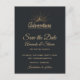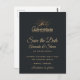 Hochzeit speichern Sie die Datumspost mit einer goldfarbenen Abbildung auf einem schwarz-grauen Hintergrund. Entworfen mit einer Abbildung eines Berges, in dem die Sonnenstrahlen von hinten leuchten. Typografie sagt: Erlebnis entdecken Traum entdecken.
