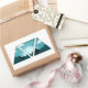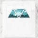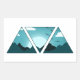 Eine Berglandschaft mit Sonne und Vögeln in drei Dreiecken in Blau-, Türkis- und Zyantönen.