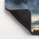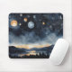 Eine wasserfarbene Bergszene mit vielen Monden und Sternen im Nachthimmel.