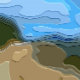 Ein helles, farbenprächtiges abstraktes Design mit Blick auf die Berge, mit blauem Himmel, Felsen und Bäumen.