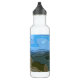 Ein helles, farbenprächtiges abstraktes Design mit Blick auf die Berge, mit blauem Himmel, Felsen und Bäumen.