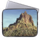 Im landschaftlichen Hauptstadt Reef Nationalpark in Torrey, Utah, erstreckt sich ein Berggipfel aus Felsen über eine Schicht dünner Wolken in den blauen Himmel. Der Gipfel besteht aus eckigen roten, bräunlichen und sandfarbenen Felsen. Der Gipfel Erholung auf einem Boden aus Schmutz, bedeckt mit zersplitterten Felsblöcken und kleinen, zerstreuten immergrünen Büschen. 35 mm, Farbfoto. Copyright © 2004 Claire E. Skinner. Alle Rechte vorbehalten.