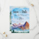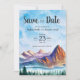 Gebirge mit Wasser und Kiefern in Aquarellen auf dem Grund des Save the Date und ein wunderschöner blauer Himmel. Sie können alle Textdetails bearbeiten. Die Rückseite der Karte hat einen nahen Teil des Kiefernwaldes.
