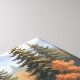 Eine gemütliche Blockhütte liegt am Ufer eines Sees, umgeben von lebhaften Herbstbäumen und mächtigen Bergen im Nebel mit einem Ruderboot