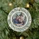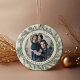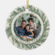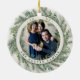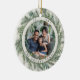 Elegantes Foto-Ornament mit einem beliebten Foto auf beiden Seiten, gerahmt von einem Kranz mit üppiger botanischer Pinienwälder auf einem warmen Elfenbeinhintergrund. Personalisieren Sie mit Ihrem Familiennamen und das Jahr rund um das Foto gebogen.