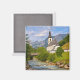 Souvenir Foto Magnet mit einer Landschaft mit einer Kirche neben einem Gebirgsbach mit in den Hinteralpen Bergen an einem Sommertag in Ramsau bei Berchtesgaden in Bayern, Deutschland, an der Grenze zu Österreich.