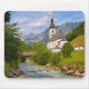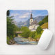 Foto-Mousepad mit Landschaft mit Kirchengemeinde an einem Bergbach, mit im Hintergrund Alpenberge an einem Sommertag in Ramsau bei Berchtesgaden in Bayern, Deutschland, an der Grenze zu Österreich.