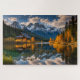 Eine rustikale Lodge neben einem See, mit schneebedeckten Bergen im Hintergrund, und aspen Bäume in vollem Herbst Ruhm schafft ein schönes Puzzle. Ideal für alle, die die Natur und die Natur im Freien Lieben.